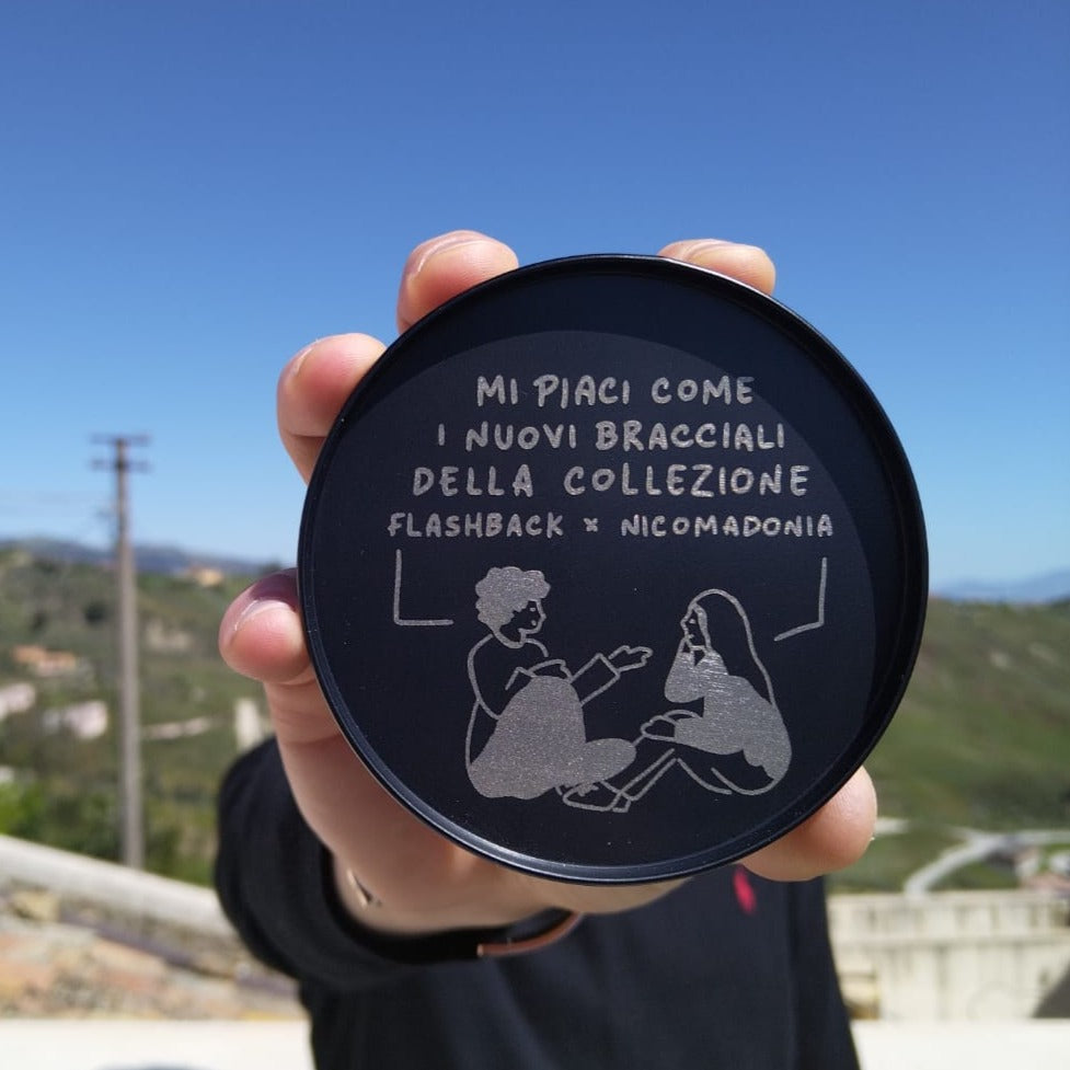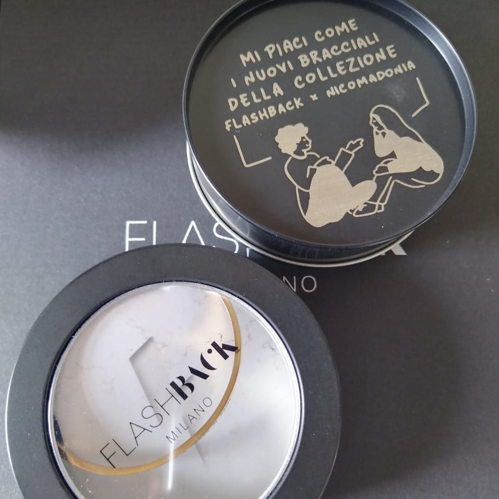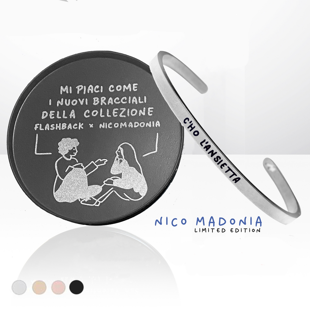 La capsule limited edition Flashback Milano x Nicomadonia è pensata e studiata appositamente per i vostri magici polsi. Un insieme di frasi iconiche di Nico che rappresentano l’ironia che ci contraddistingue nell’affrontare la quotidianità. Un bracciale flashback è un modo per ricordarci di sorridere sempre anche nei momenti bui, perché tanto lo sappiamo: anche oggi andrà tutto a cazzo di cane