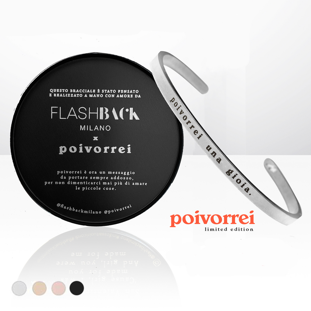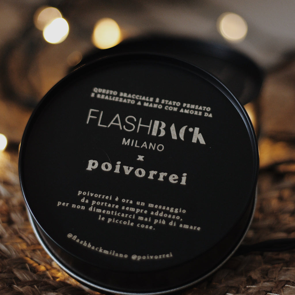 poivorrei (r)accoglie i desideri delle persone, Flashback li incide nella memoria.Dopo aver ricevuto sul sito poivorrei più di 200.000 desideri e speranze, insieme ai ragazzi di Flashback Milano abbiamo pensato di dargli ora una forma concreta, da portare sempre addosso.Nascono così i bracciali Flashback x poivorrei: semplici e belli come i migliori desideri.